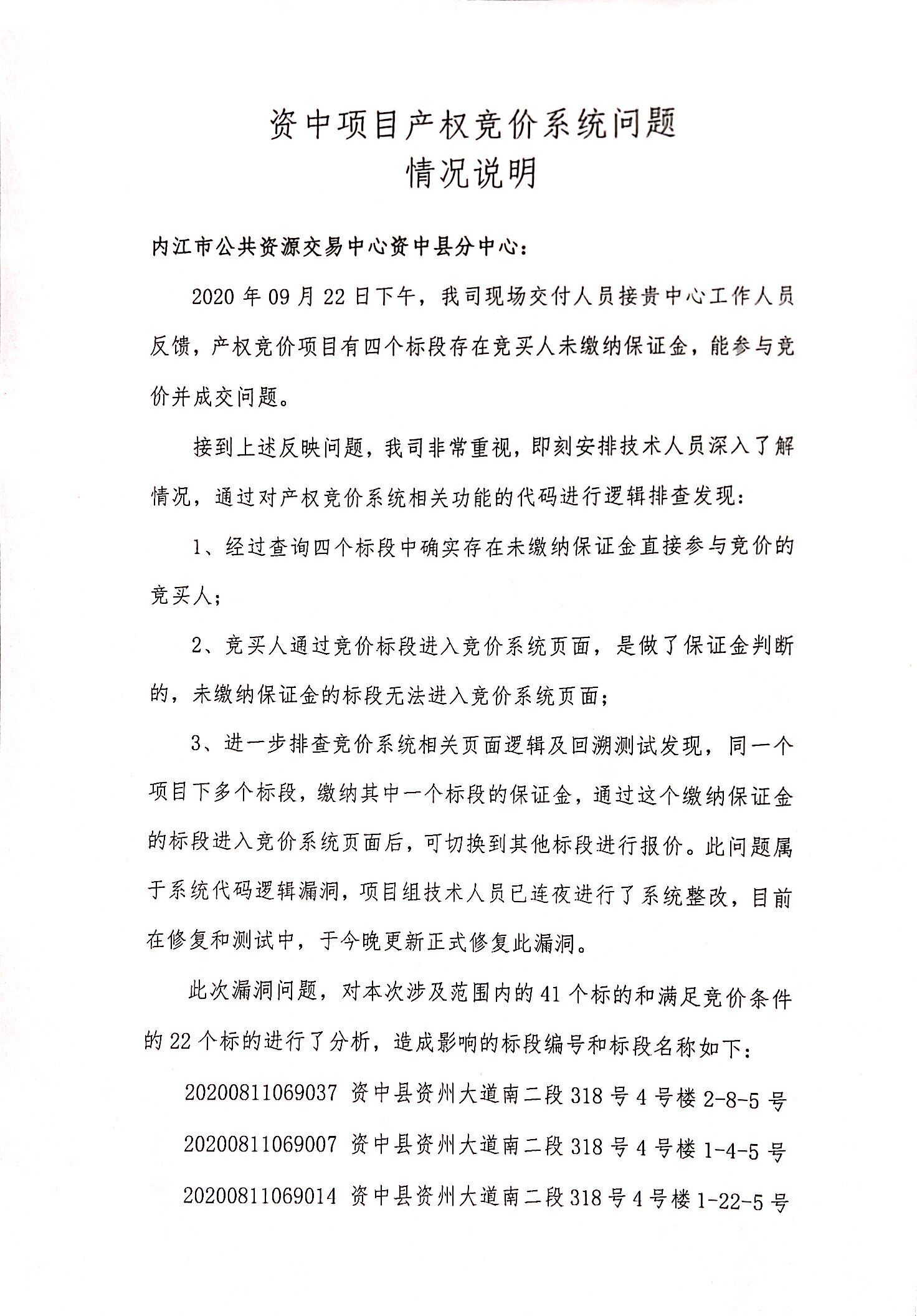 《资中县资州大道安置还房住宅房屋( 公开竞租)》项目于2020年9月21日进行了网上竞价,22日中心工作人员在审核准备发布结果公告时发现有四个竞价标的竞价结果异常,立即停止了对这四个标的的竞价结果公告,并告之系统软件开发商新点软件公司进行核查。新点软件公司核查结果为:产权竞价系统代码逻辑漏洞,竞价人利用漏洞造成了竞价结果异常。新点软件公司已于当晚更新正式修复此漏洞。