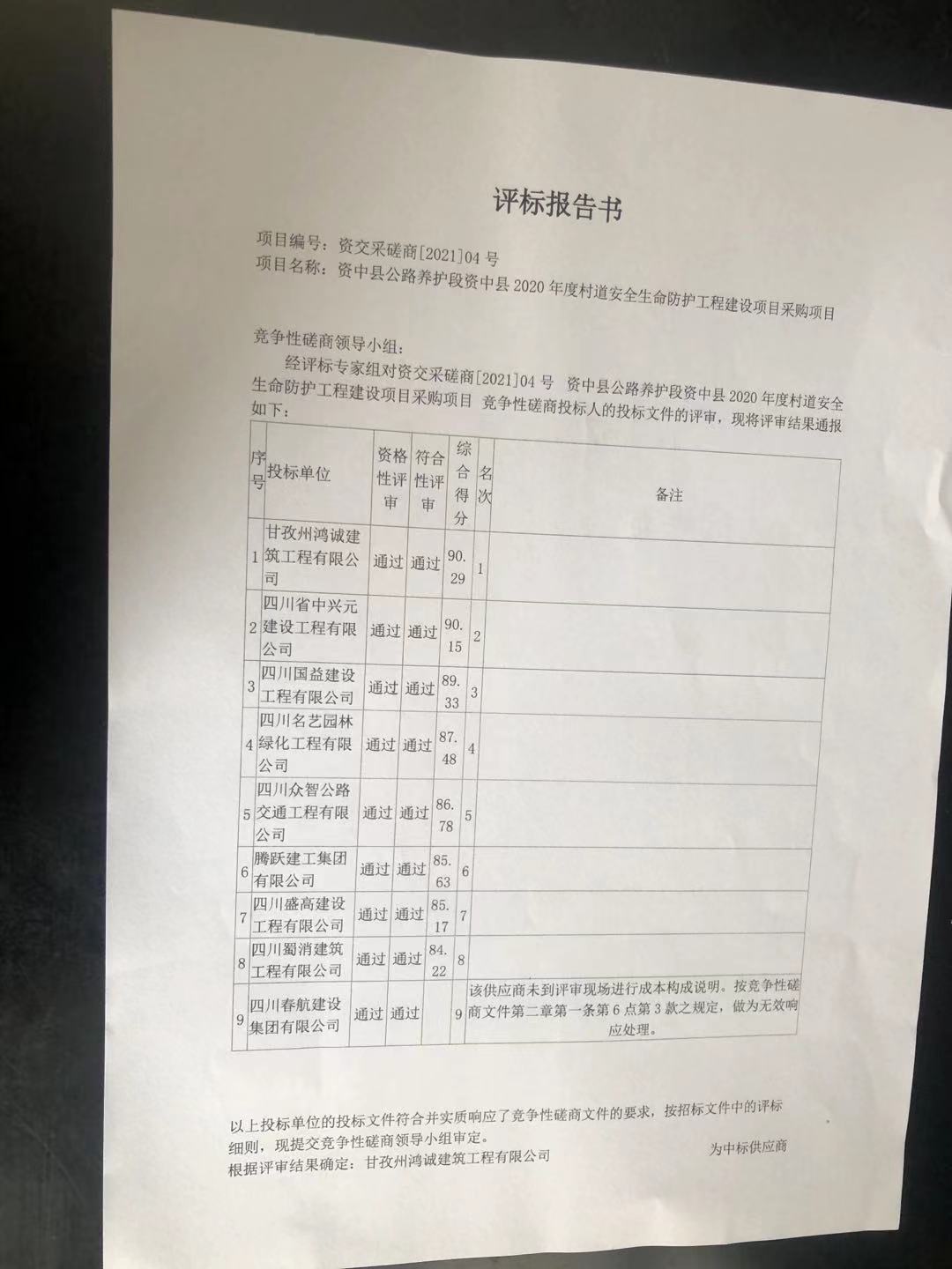 资中县2020年度县乡公路综合安保工程建设采购项目结果公示