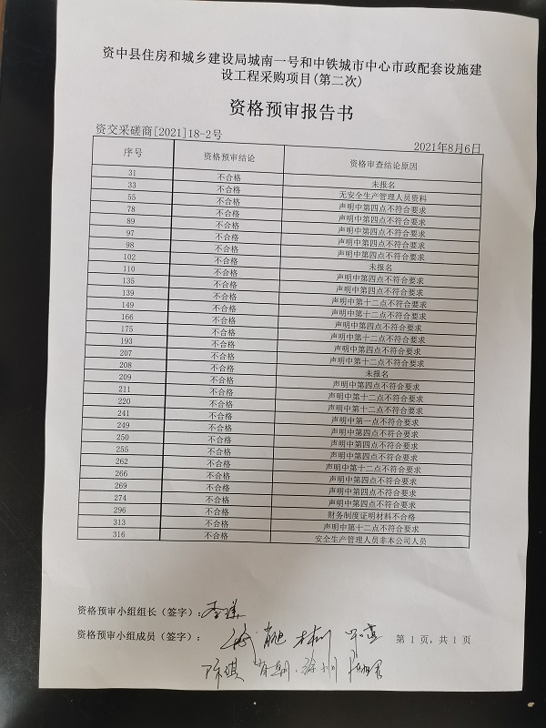 资中县城南一号和中铁城市中心市政配套设施建设项目结果公示