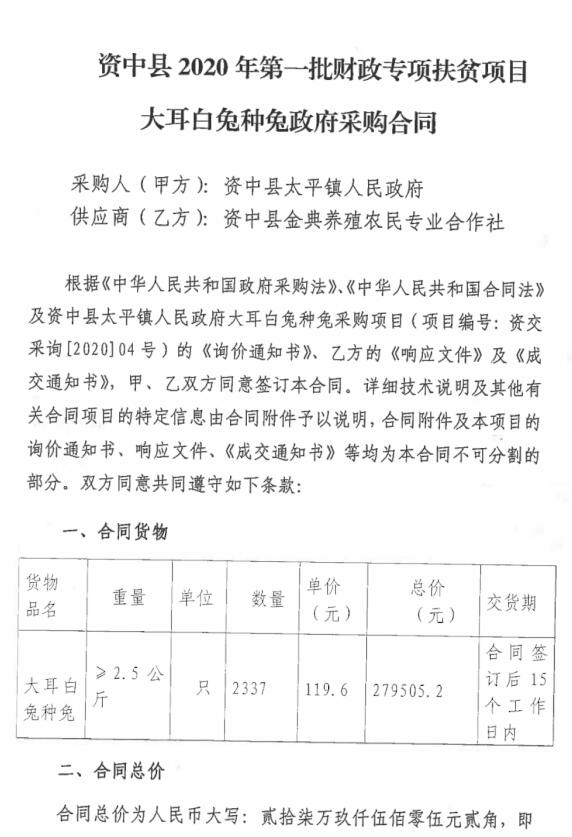 [合同备案]2020年扶贫资金(第一批)物资采购:大耳白兔种兔