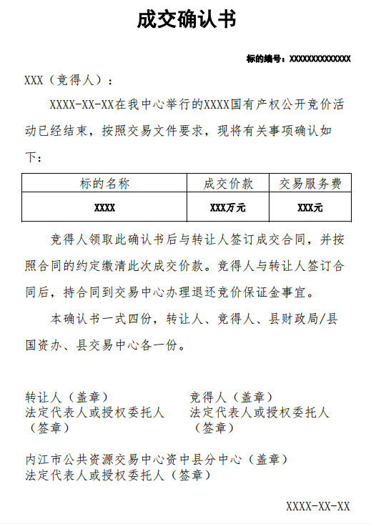 7、竞得人凭《成交确认书》与转让方签订转让合同。转让方在签订合同后3个工作日内报送国资监管机构和县交易中心备案。