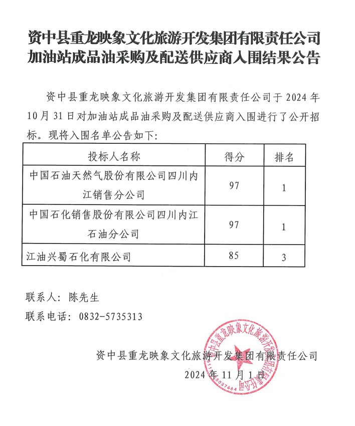 资中县重龙映象文化旅游开发集团有限责任公司加油站成品油采购及配送供应商入围结果公告