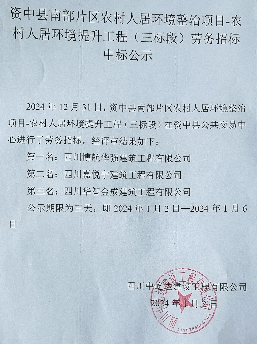 资中县南部片区农村人居环境整治项目-农村人居环境提升工程(三标段)劳务招标中标公示