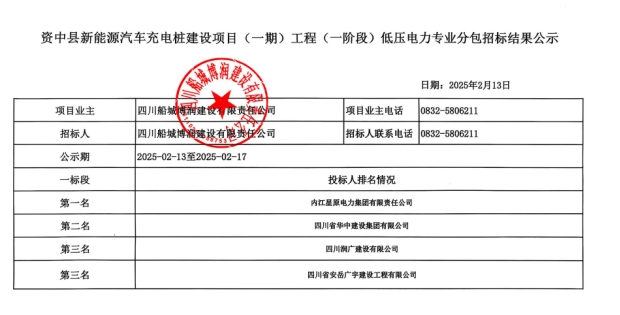 资中县新能源汽车充电桩建设项目(一期)工程(一阶段)低压电力专业分包招标结果公示