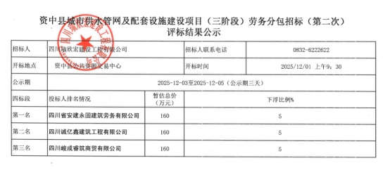 资中县城市供水管网及配套设施建设项目(三阶段)劳务分包招标(第二次)评标结果公示