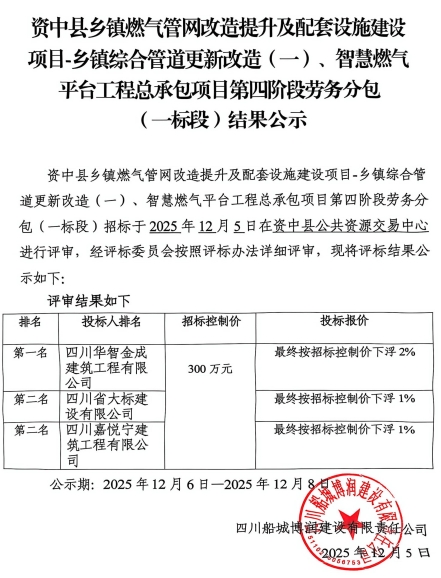 资中县乡镇燃气管网改造提升及配套设施建设项目-乡镇综合管道更新改造(一)、智慧燃气平台工程总承包项目第四阶段劳务分包(一标段)评标结果公示