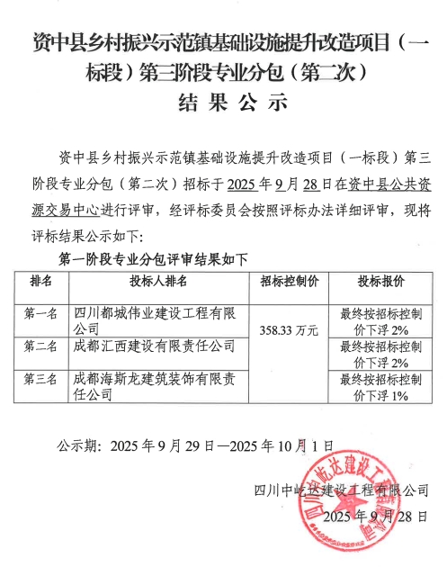 资中县乡村振兴示范镇基础设施提升改造项目(一标段)第二阶段专业分包(第二次)结果公告