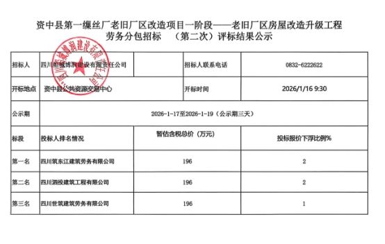 资中县第一缫丝厂老旧厂区改造项目一阶段--老旧厂区房屋改造升级工程劳务分包(第二次)评审结果公示