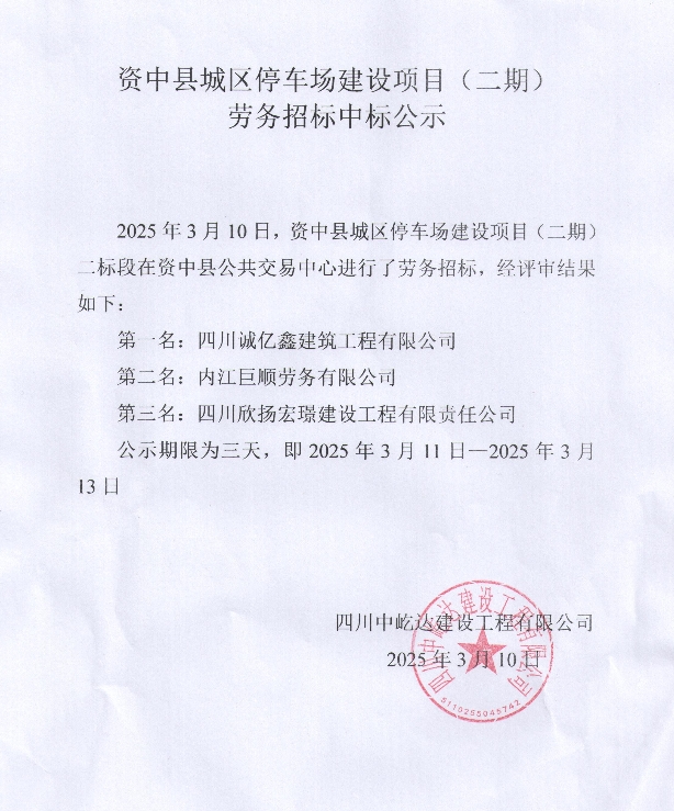资中县城区停车场建设项目(二期)二标段劳务招标中标公示