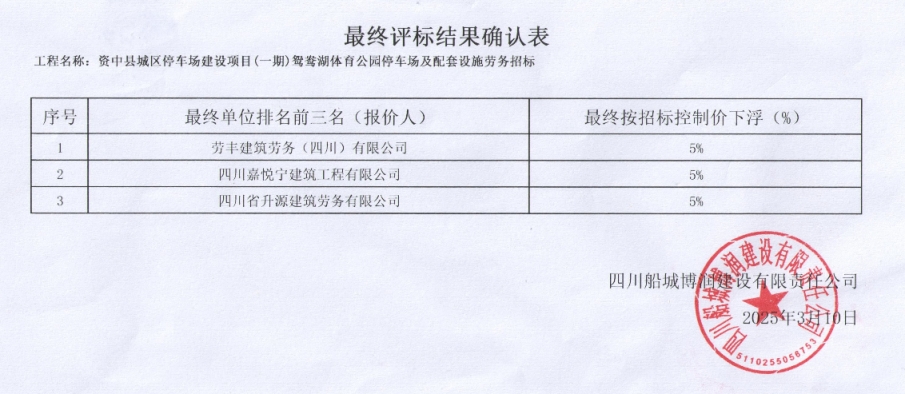 资中县城区停车场建设项目(一期)鸳鸯湖体育公园停车场及配套设施劳务招标中标公示