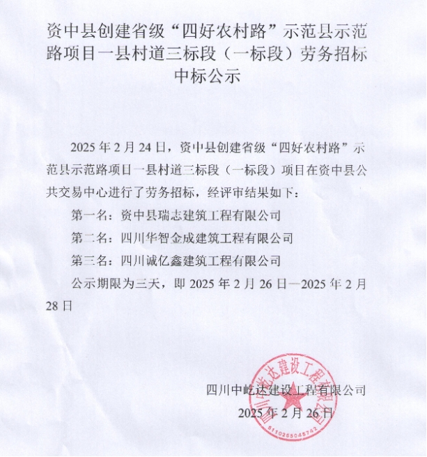 资中县创建省级“四好农村路”示范县示范路项目 一县村道三标段(三标段)劳务招标 中标公示