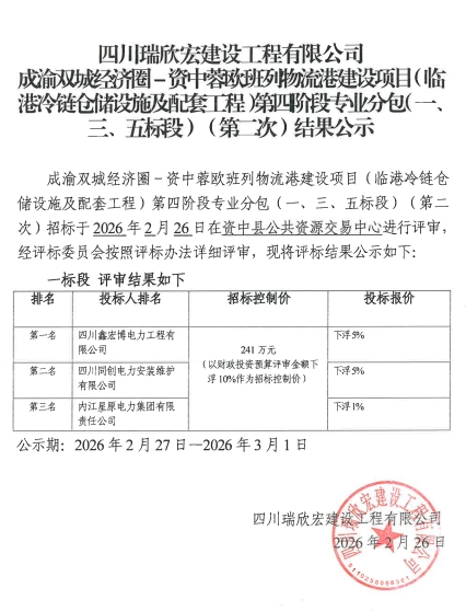 成渝双城经济圈-资中蓉欧班物流港建设项目(临港冷链仓储设施及配套工程)四阶段专业分包(一、三、五标段)(第二次)结果公示