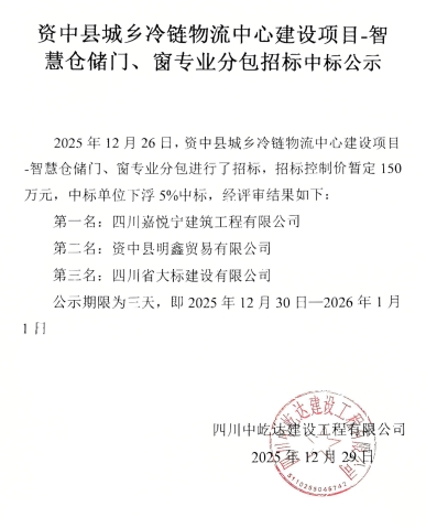 资中县城乡冷链物流中心建设项目-智慧仓储门窗专业分包中标公式