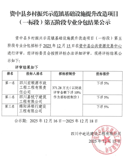 资中县乡村振兴示范镇基础设施提升改造项目(一标段)第五阶段专业分包结果公示