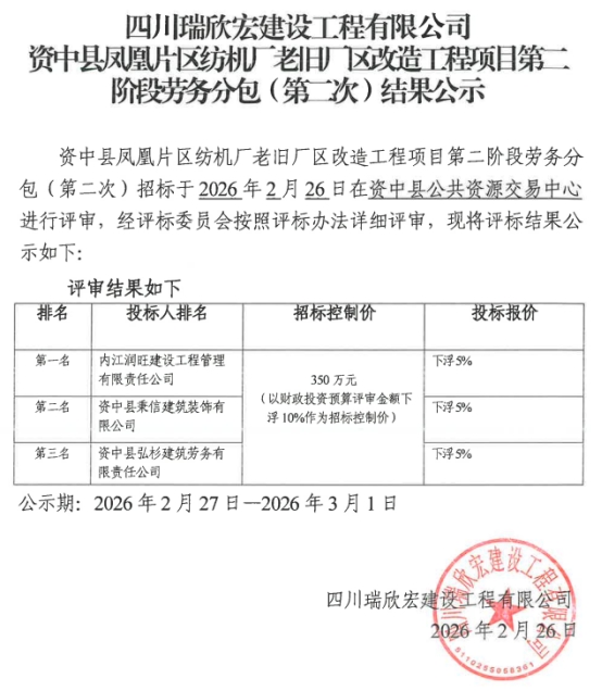 资中县凤凰片区纺机厂老旧厂区改造工程项目第二阶段劳务分包(第二次)结果公示
