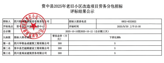 资中县2025年老旧小区改造项目劳务分包招标评标结果公示