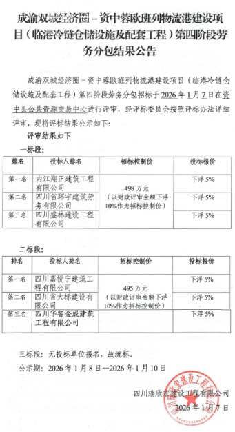 成渝双城经济圈-资中蓉欧班列物流港建设项目(临港冷链仓储设施及配套工程)第四阶段劳务分包结果公告