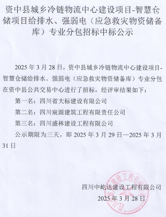 资中县城乡冷链物流中心建设项目-智慧仓储项目给排水、强弱电(应急救灾物资储备库)专业分包招标中标公示