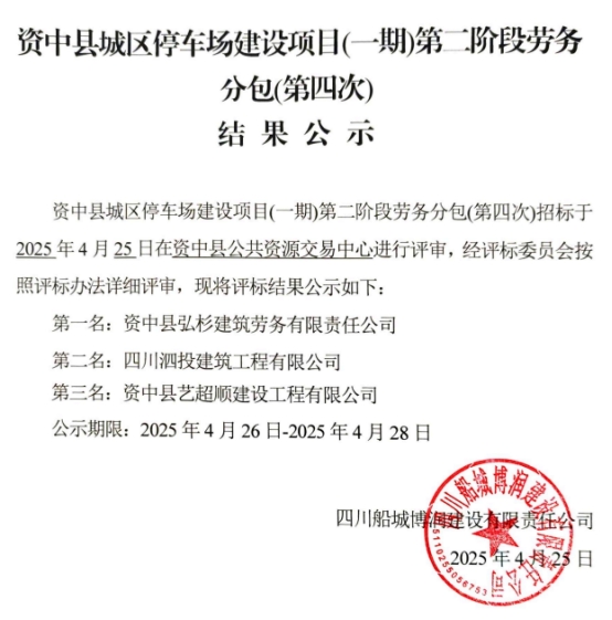 资中县城区停车场建设项目(一期)第二阶段劳务分包(第四次)结果公示