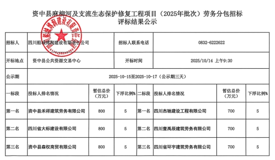 资中县麻柳河及支流生态保护修复工程项目(2025年批次)劳务分包招标评标结果公示