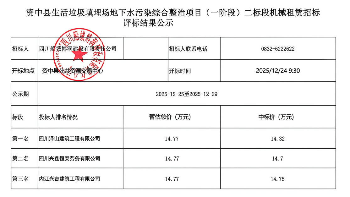 资中县生活垃圾填埋场地下水污染综合整治项目(一阶段)二标段机械租赁招标评标结果公示